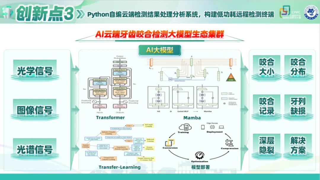 Addressing the pain points of high energy consumption and high costs in the oral medical field, the project fully leverages the disciplinary advantages of the School of Physics and Optoelectronic Engineering. It innovatively proposes a passive sensor as the core, integrating multi-modal data collection of optical, image, and spectral signals, and constructs large AI models based on advanced architectures such as Transformer and Mamba for intelligent diagnosis. The team also independently developed a cloud-based analysis system using Python, successfully building a full-process, low-power remote dental testing platform covering signal acquisition, model inference, and diagnostic recommendations. This platform achieves significant energy conservation and carbon reduction effects, demonstrating the solid professional foundation and outstanding innovative capabilities of the school's students. It effectively reduces the reliance of traditional dental testing on professional equipment and offline diagnosis and treatment, serving as a model achievement of in-depth interdisciplinary integration between physical and optoelectronic technologies and clinical medical needs.
